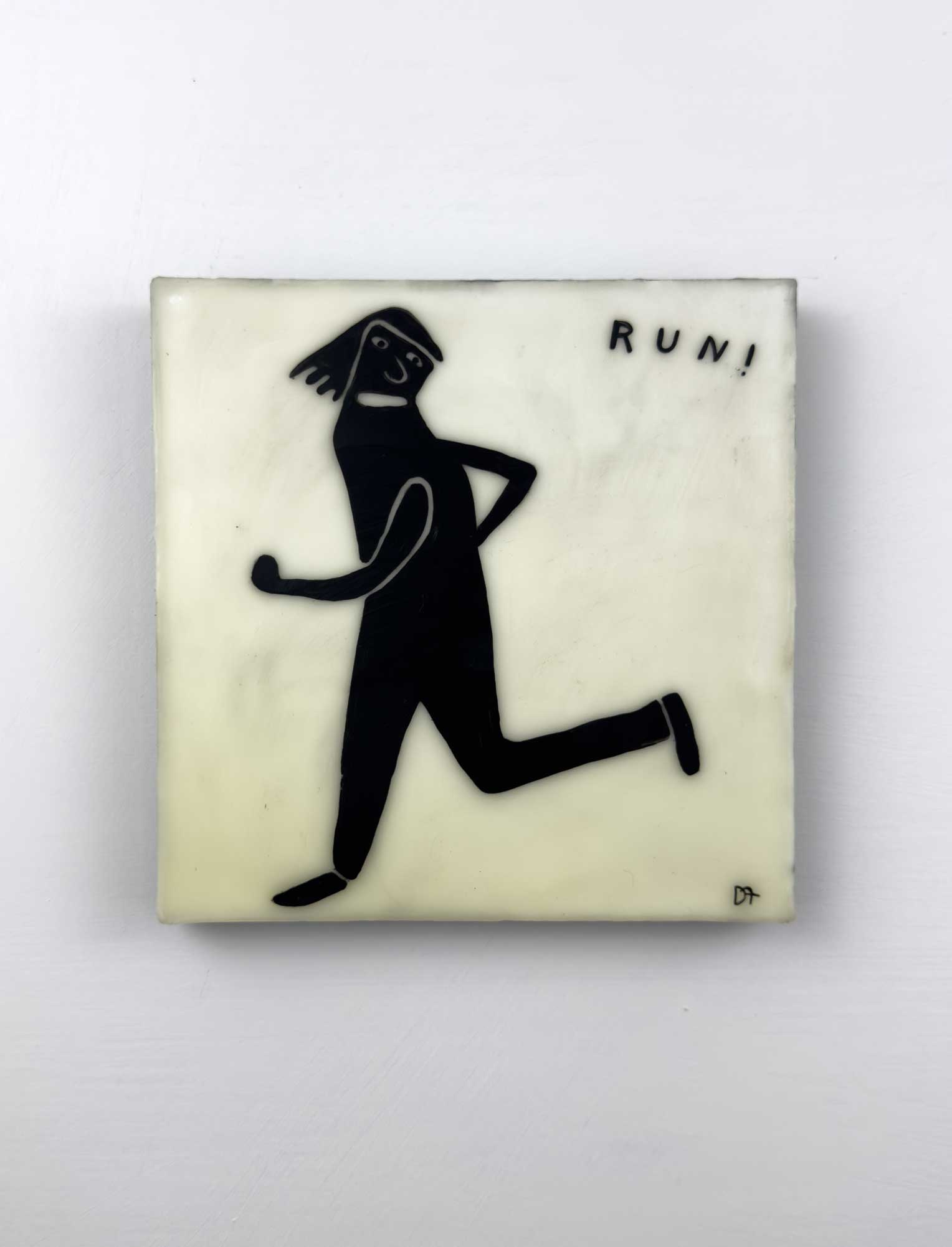 "Run" captures the timeless (and slightly ridiculous) human instinct to bolt at the first sign of… something. A single, frantic silhouette dashes through the scene, propelled by an unseen fear that may or may not exist. Fear and anxiety is a favorite theme of the artist...and this piece has just enough of both, with a little mystery to keep you wondering — and maybe laughing — every time you see it.