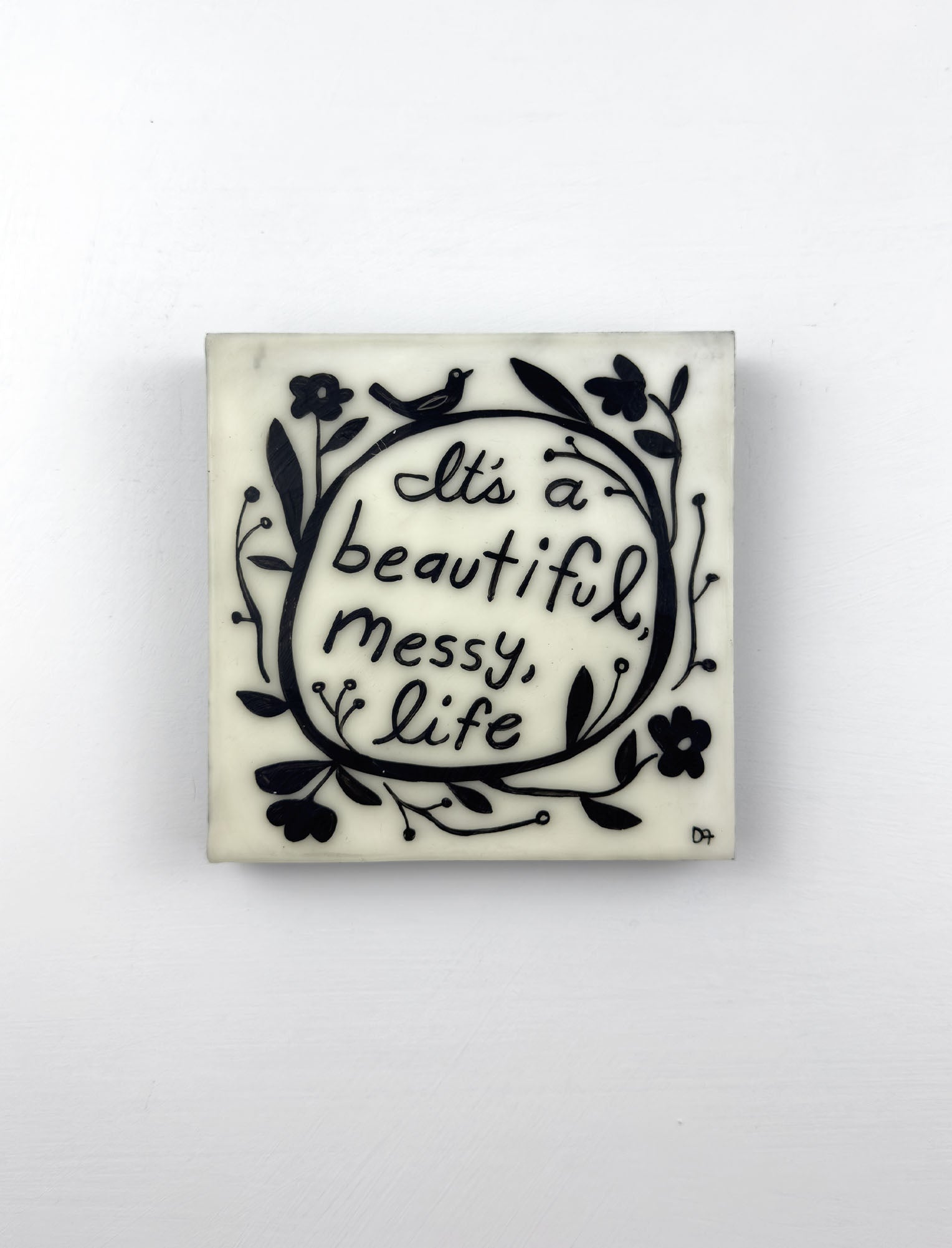 This painting is a gentle reminder to embrace the chaos with grace and humor, because although life isn’t always neat, it’s still beautiful. The imperfect wreath and honest words come together in a piece that feels both personal and universal.