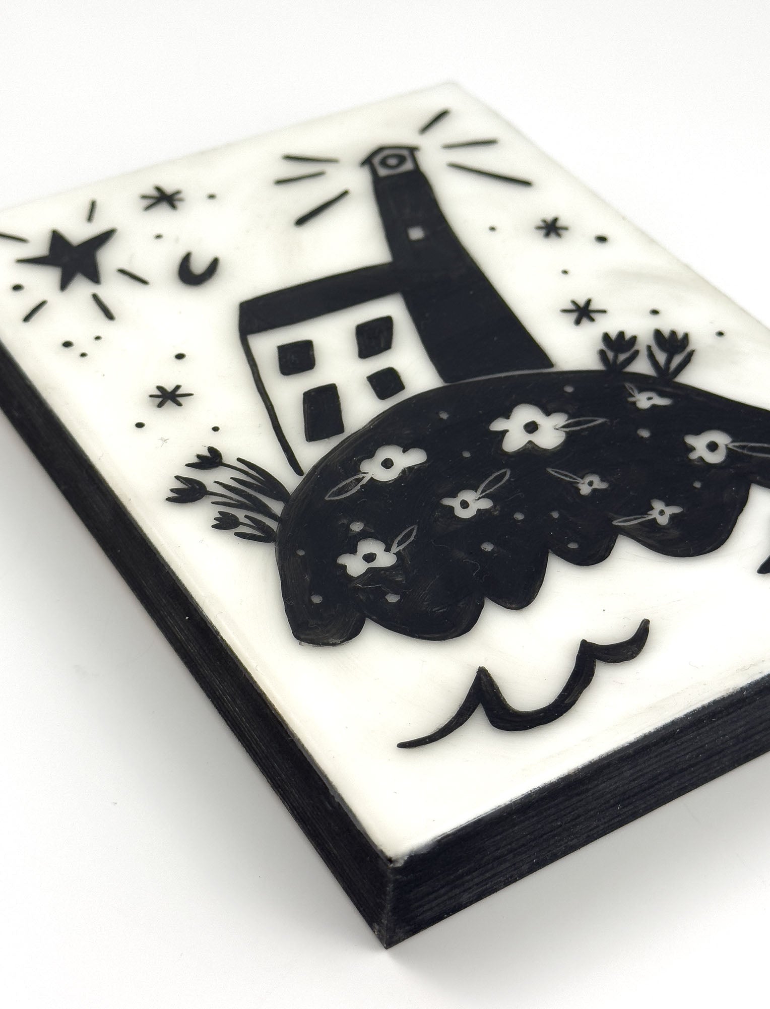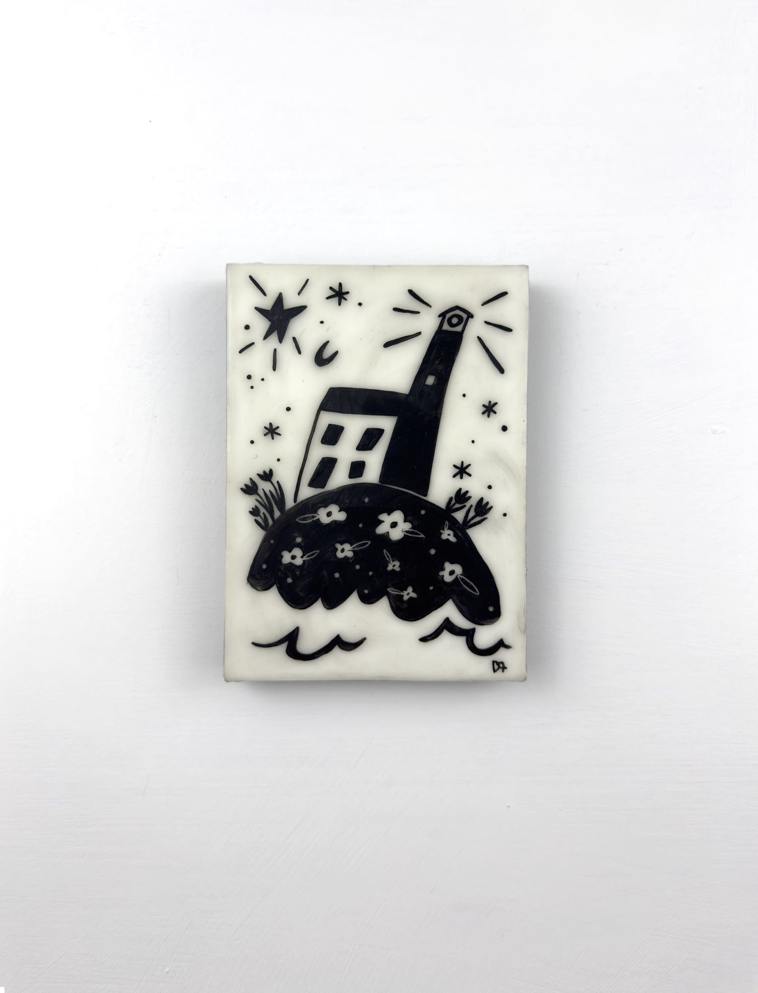 A tiny lighthouse stands quietly on a "Little Island" surrounded by delicate flowers. It’s a quiet place to go that invites calm in the midst of the wild waves.