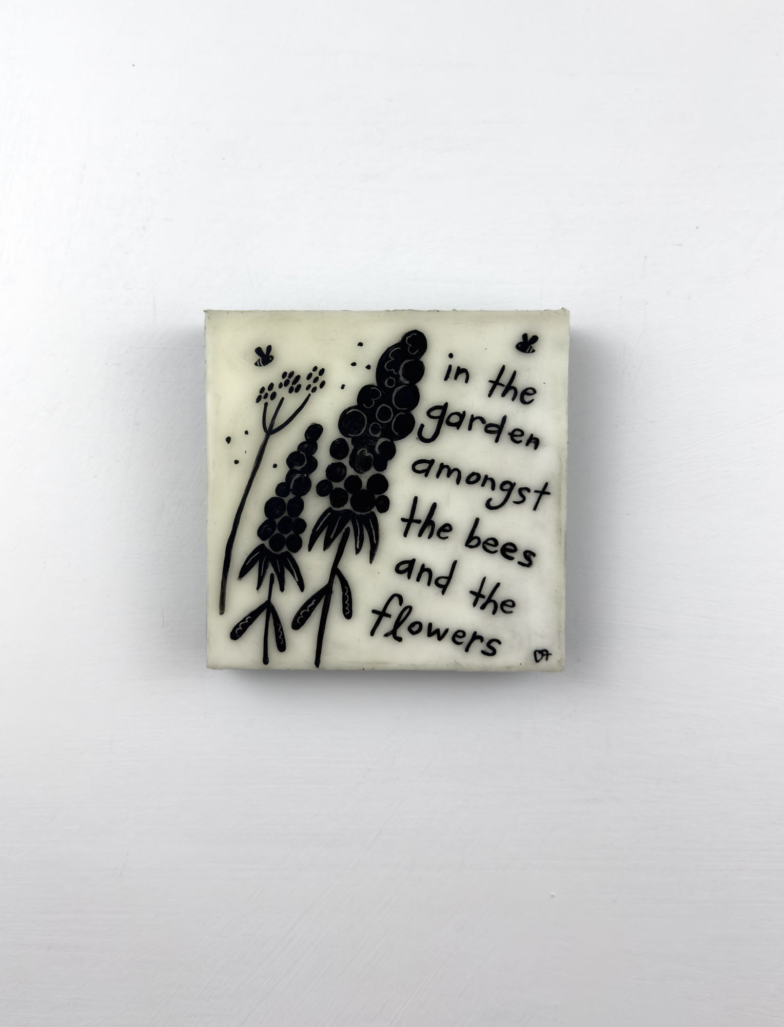 Hand-painted words float gently around a cluster of blooms and buzzing bees. "Amongst the Bees" is about being right where you are among the flowers and the soft hum of things in motion.