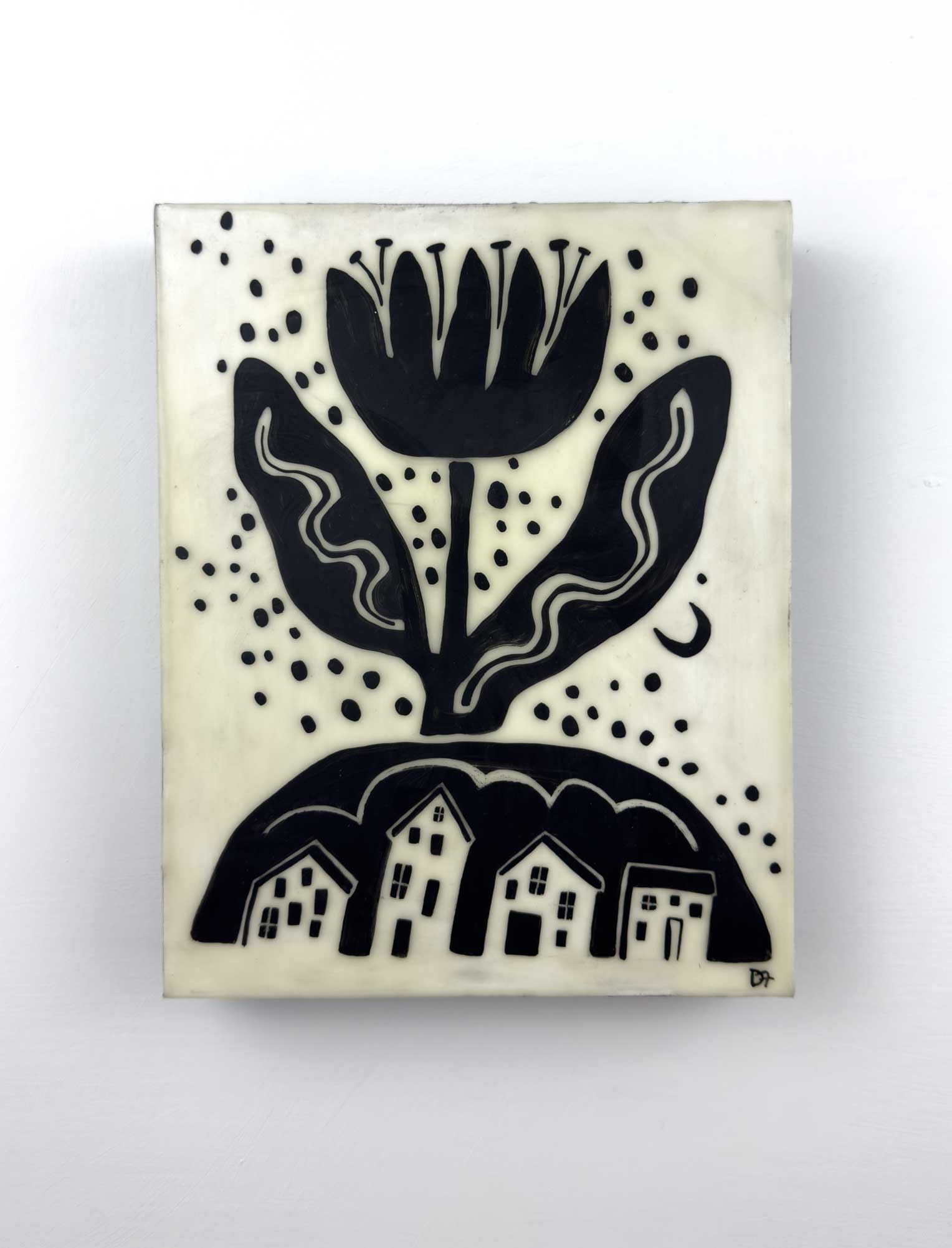 A place that could only exist in dreams — and maybe that's the point. "Fanciful Village" invites you into an imagined landscape where a towering flower rises above a quiet row of simple houses nestled beneath a rolling hill. A surreal scene that feels both comforting and impossible, and captures the essence of daydreaming — playful and serene.